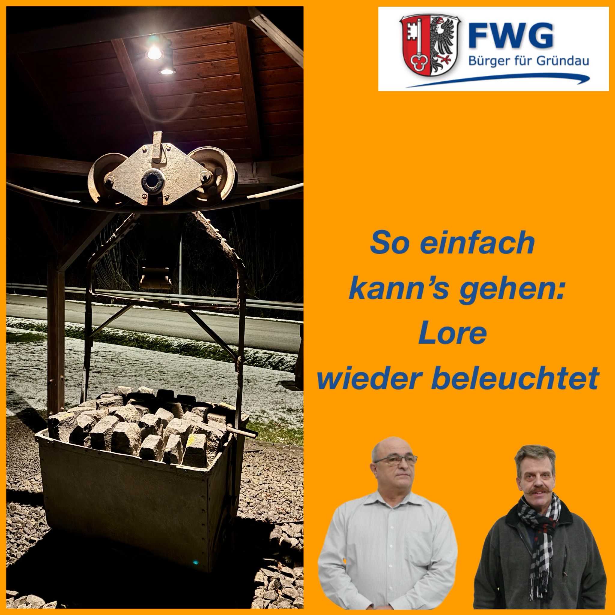 Die Lore wird wieder angestrahlt und ist endlich wieder das, was sie sein soll – ein sichtbares Zeichen der Ortsgeschichte. 👀✨